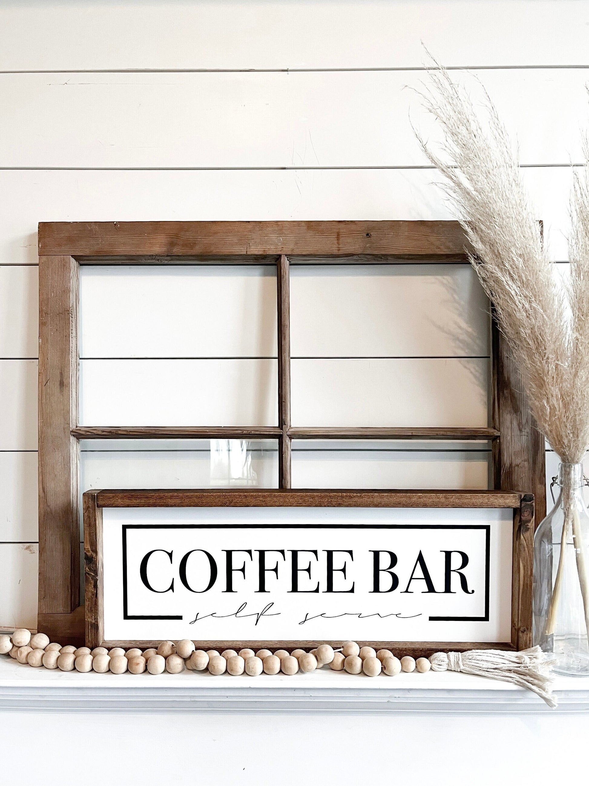 "Coffee Bar Self Serve" framed wood sign