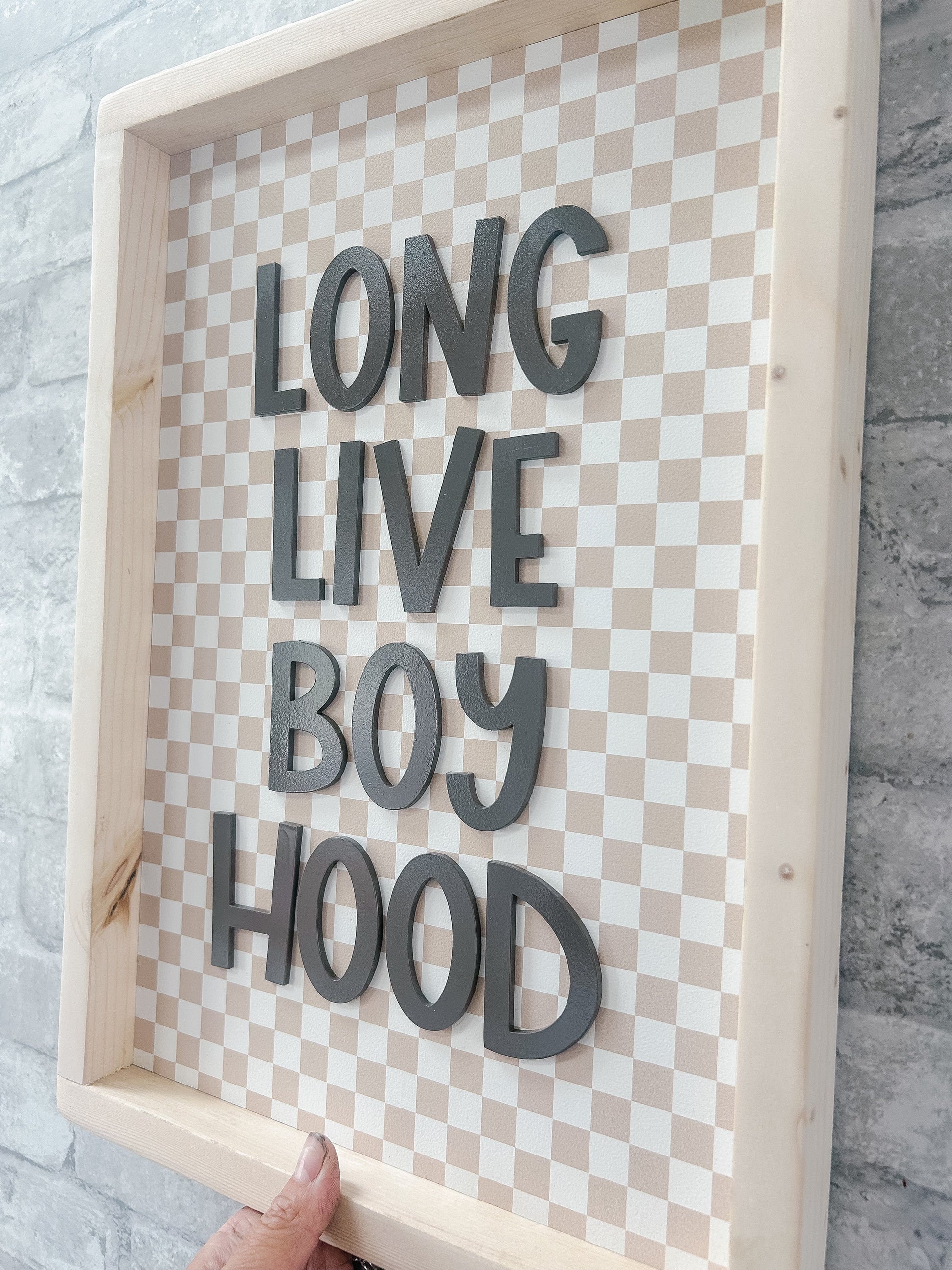 Professionally printed directly to a wood back with the light gingham pattern. 3D lettering in a dark taupe colour added for the perfect touch!